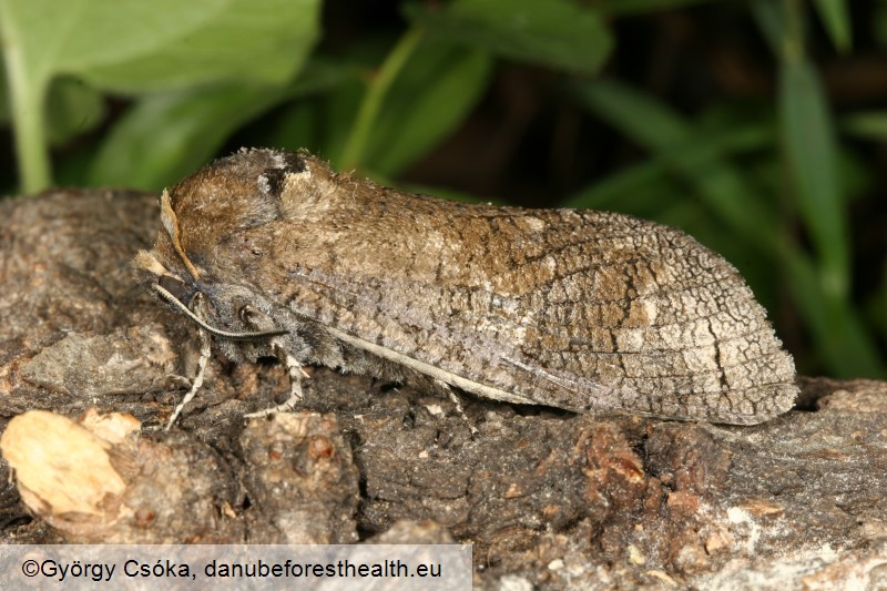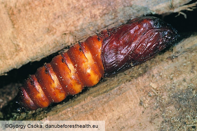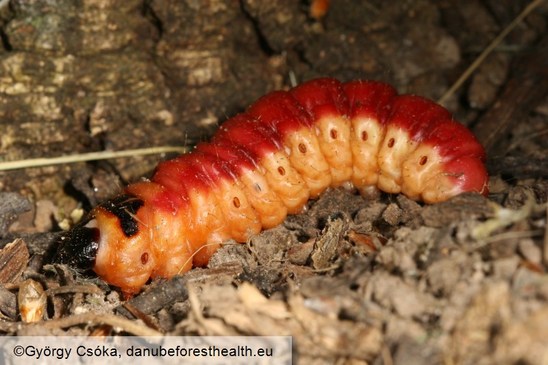 Large moth (wingspan: 68-96 mm). wings are grey brown with a wavy pattern. Caterpillars are large (max 10 cm long) and are reddish. The head and patches behind the head are black. The caterpillar first is hibernating under the bark and later makes large tunnels in the wood. The pupae is 45mm long and brown. The attacked trees can be recognized by the fermenting liquid at the tree base. The development time is 2 to 3 years.