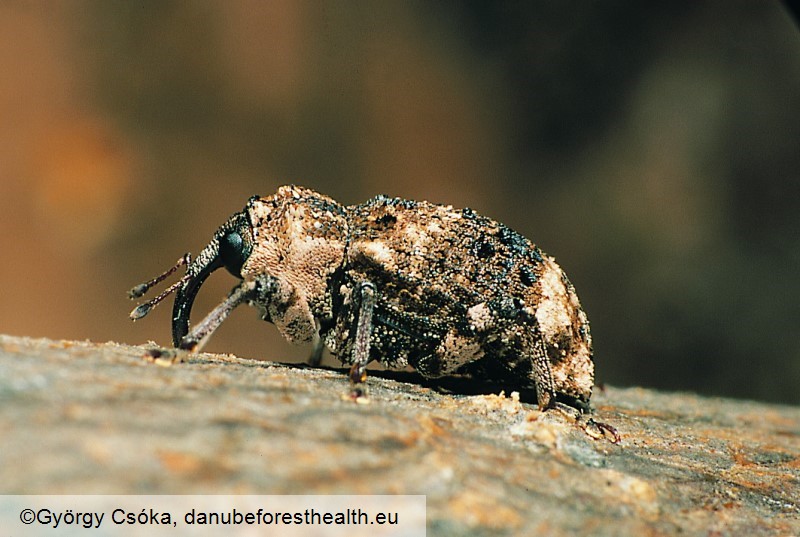 Weevil with a medium length snout. The elytra are covered with tufts of dark and light hairs. The larvae are whitish, curved and legless. The larvae have five to six instars. Till the first three instars they are feeding in the cambium, after that in the sapwood. Therefore, a characteristic is the dark sawdust in the beginning and light sawdust later in the season laying beneath the attacked trees. Because the larvae is feeding in the core of the tree, twigs become thickened and deformed. The Exit holes have an elongated shape.
