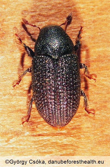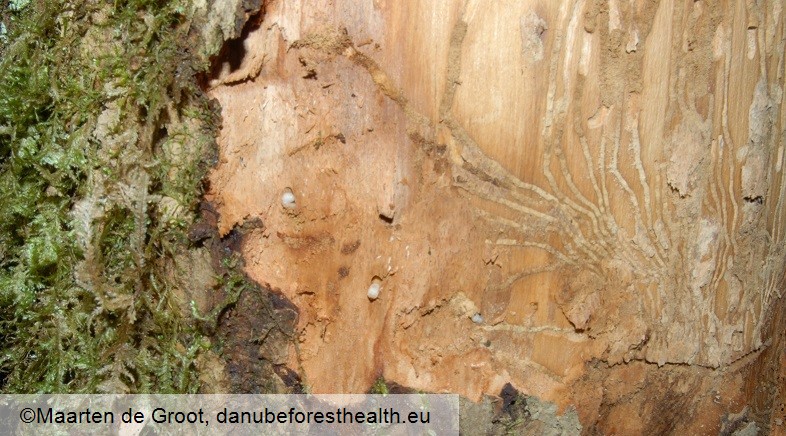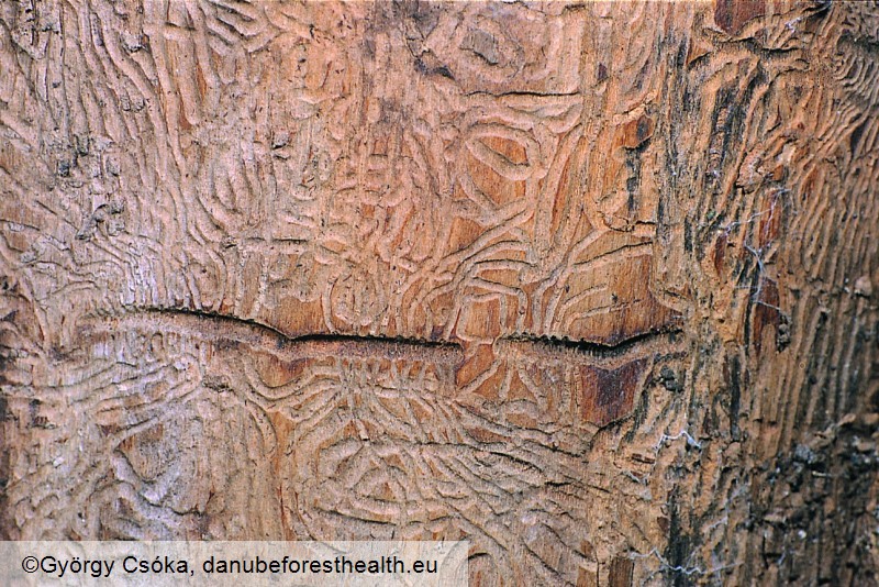 Adults are relatively large black bark beetles (4-6 mm). The adults are making a characteristic V-shaped gallery system in the cambium with each branch is 3 mm wide and 5-6 cm long. The larval tunnels are perpendicular of the maternal tunnels. The adults are hibernating in overwintering galleries which give the characteristic galls on the bark.