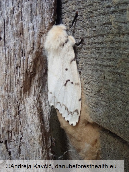 Adults are grey to brown or creamy white moths. They measure 15–35 mm in length and 37–62 mm across the wings. Females are larger than males. They have several dark brown winding transverse lines on forewings. In European populations only males can fly. The gipsy moth develops one generation per year. The moths emerge from July to August. After mating, the female lays small, round eggs in groups (egg masses), preferably close to the ground. Eggs are protected by a thick orange-brown cover, made of female´s hair. Eggs overwinter. Larvae hatch in April and start feeding on leaves. Young larvae are black and hairy, with orange brown tubercles, each bearing a tuft of long light hairs. Older larvae have yellowish head and pairs of blue (front 5 pairs) and red (rear 6 pairs) tubercles on the dorsal side of the body. While the young larvae feed during the day the older larvae are nocturnal. A grown caterpillar is 60–70 mm long. It pupates between leaves, spun together by silky threads, in June or July. The pupa is dark brown with sparse golden hair. Female pupa is longer (15–35 mm) than the male pupa (15–20 mm).