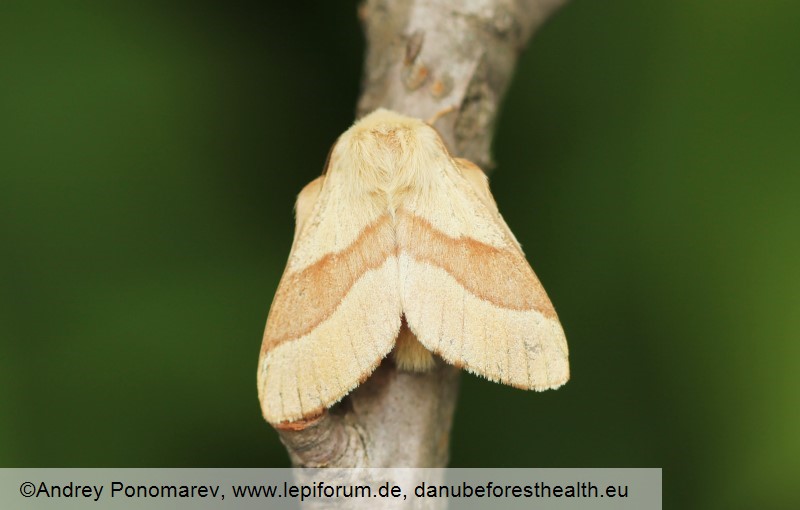 Adults vary in colour from creamy white, sandy yellow or brown to reddish. They have a wide bordered transverse band across the middle of each forewing. Males are smaller than females. Wingspan is 25–32 mm in males, and 38–42 in females. Adults emerge from June to September. A fertilized female lays eggs in clutches forming a ring around twigs. Eggs overwinter. Larvae hatch in April or May. At the beginning, they live gregariously in nests made of silky threads that they produce. Later they disperse and live singly. Larvae are hairy and have a blue head. Vivid white, orange, black and blue lines run along the dorsal side of the body. They grow to 50 mm. The larva pupates among the leaves in the understory, in a light cocoon made of silky web, in June. Pupa is dark brown and bare.