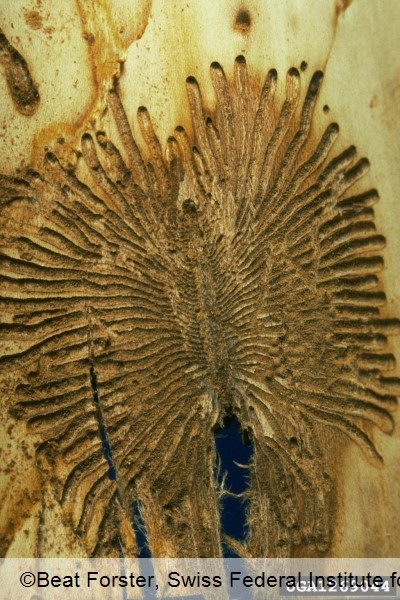 The smaller elm bark beetle is a serious pest of elms (Ulmus spp.) throughout Europe. It causes tree death and wood loss. Damage is caused by larvae, which feed on phloem and create extensive galleries in the bark. The beetle is also a vector of phytopathogenic fungi that cause Dutch elm disease (Ophiostoma ulmi, O. novo-ulmi). Minor damage is caused by maturation feeding on twigs. Damage is caused throughout the season.