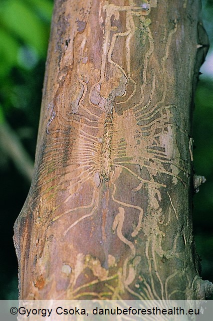 Natural habitats, nurseries, plantations and urban areas. Beetles develop in the bark of elm trees (Ulmus spp.), rarely on other woody plant species (ash, walnut, oaks, willows, poplar and aspen, stone fruits). They mainly attack old, large-sized elm trees that are weakened by various stress factors, such as drought, pruning, diseases, defoliators, … Brood development generally takes place in the lower part of the trunk. Young beetles choose healthy and vigorous trees for maturation feeding.