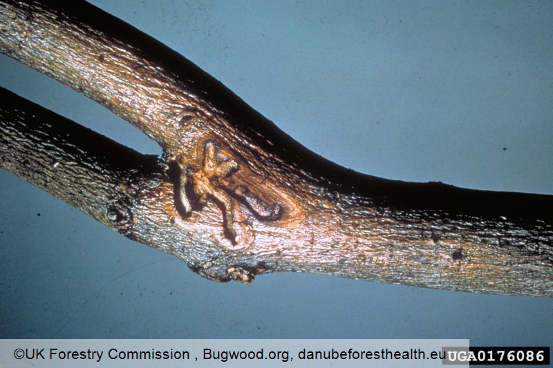 The larger European elm bark beetle is a serious pest of elms (Ulmus spp.) throughout Europe. It causes tree death and wood loss. Damage is caused by larvae, which feed on phloem and create extensive galleries in the bark. The beetle is also a vector of phytopathogenic fungi that cause Dutch elm disease (Ophiostoma ulmi, O. novo-ulmi). Minor damage is caused by maturation feeding on twigs. Damage is caused throughout the season.