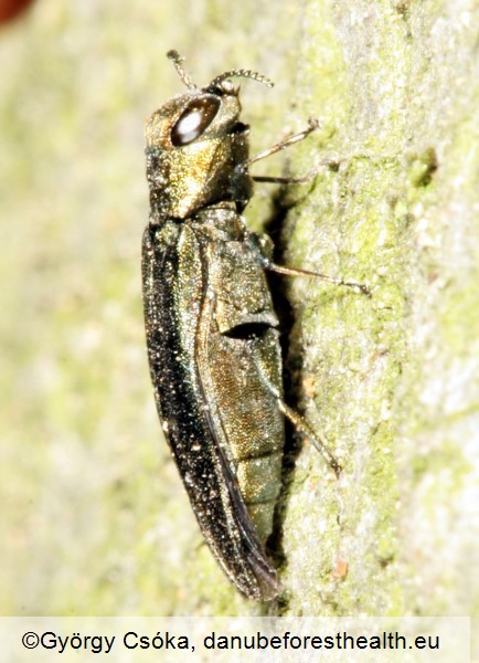 The adult is a large shiny green buprestid beetle (8 to 14 mm). The larvae is has a typical shape of a buprestid beetle with a first few segments widened while others are narrow and is creamy white colored. The life cycle is 1 to 2 years. Significant damage to the trees are the S shaped galleries under the bark. This causes dark spots on the bark. When adults are exiting the trees it produces a typical D-shaped exit hole.