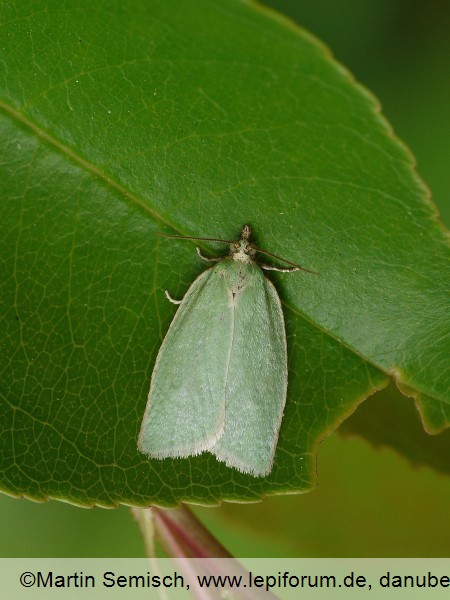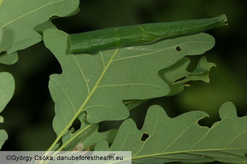 Moths are bicolour. They have grass green thorax and forewings with the wingspan of 18–23 mm, hindwings and the abdomen are grey. They have one generation per year. Adults emerge in May or June. Females lay eggs in pairs on shoots near buds in the crown of oaks and other broadleaved trees. Eggs overwinter. Larvae hatch in spring, when leaves start to grow (April – May). They feed on buds, leaves and flowers for about one month. They are hairless, grey green, with small black tubercles on each body segment and a black to brown head. They feed for about one month and reach about 20 mm in length. The larva rolls the leaf margin into a roll, or folds and ties together more leaves, where it first feeds and later pupates between the leaf folds. Pupa is 8–10 mm long, first green, later dark brown.