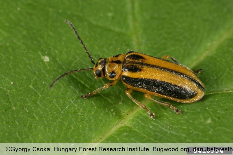 Adults are 6–8 mm long beetles. The body is dark olive green, with a wide golden stripe along each elytron. The pronotum bears a black hourglass mark in the middle, with a black dot on each side. The beetle has 2 generations per year. Adults overwinter. In the early spring, females lay eggs on the underside of elm leaves. Each female lays up to 800 eggs in groups of 25. Eggs are yellow with a pointed tip. Larvae hatch after a week and immediately start feeding on the underside of leaves, thus causing skeletonization of elm leaves. Larvae are dark olive green, with a yellow stripe along each side of the body, and up to 13 mm long. Larve pupate on the underside of leaves or in bark crevices. The pupa is orange yellow. Adults of the first generation hatch in the mid-summer and produce the second generation of beetles. Adults of the second generation overwinter (in the ground, … often in houses).