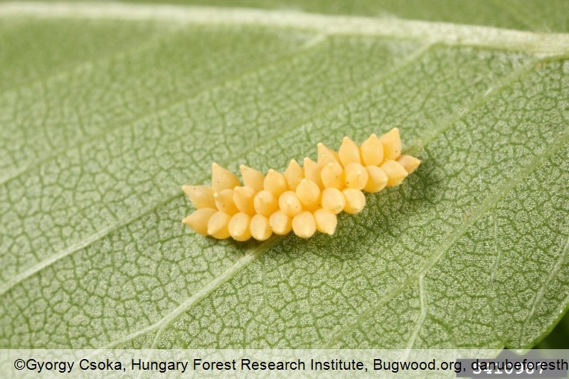 Natural habitats, nurseries, plantations and urban areas. Larvae feed on the underside of elm (Ulmus spp.) leaves.