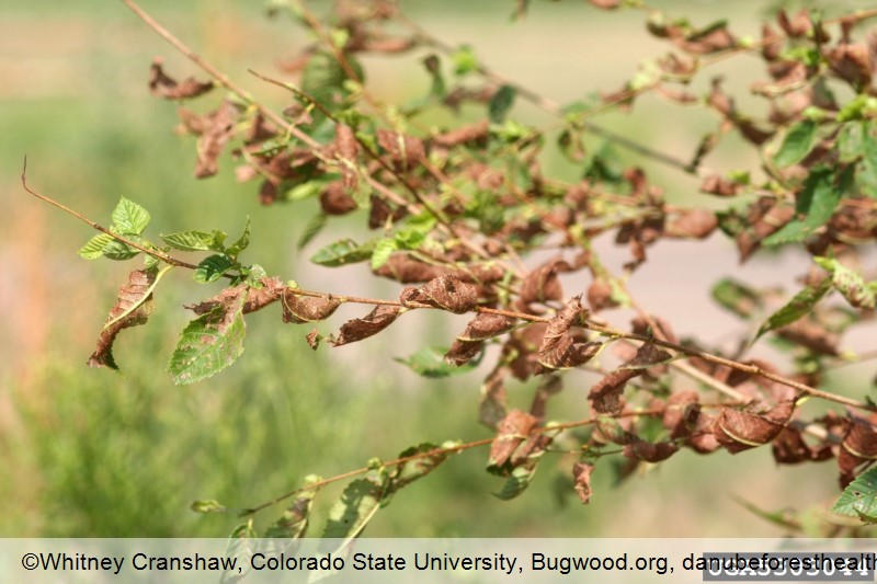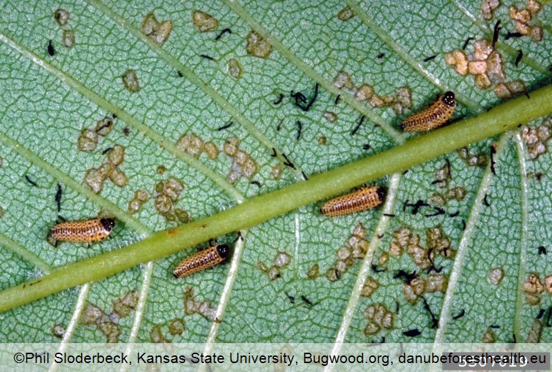 Damage is caused by larvae and adults, which feed on elm leaves and cause skeletonization and defoliation. Damage is caused throughout the season. During a massive attack and the loss of a large amount of photosynthetic tissue, the tree gradually loses its vigour and defence ability. A weakened tree has stunted growth and is more susceptible to negative impacts of biotic and abiotic environmental factors. The elm leaf beetle is a serious pest of elm (Ulmus spp.).