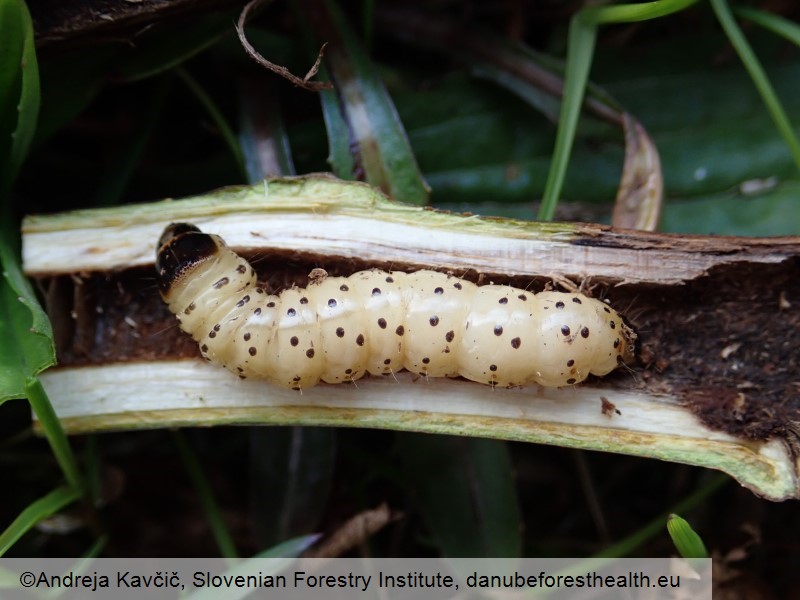Symptoms and signs resemble those of other wood boring insects, such as the goat moth, Cossus cossus. However, Zeuzera pyrina adults and larvae can be easily distinguished from other species.