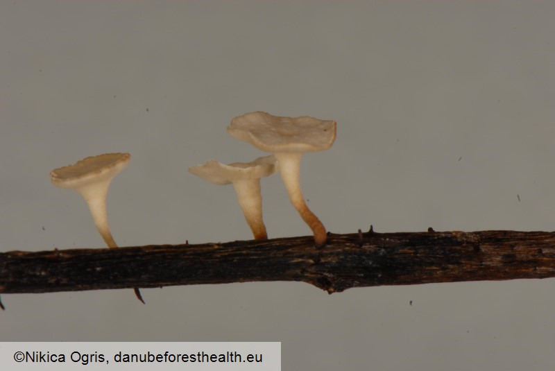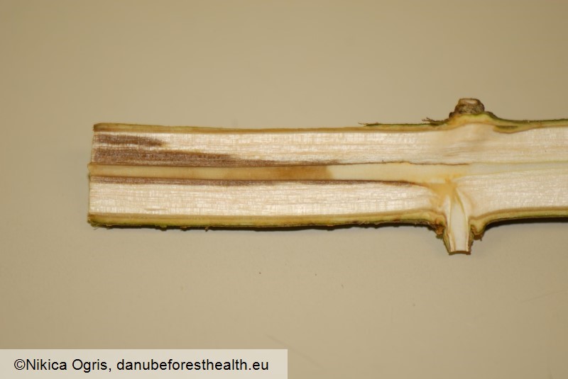 The fungus enters the host through leaves and leaf rachises where it causes lesions (Fig. 1). Ash leaves wilt (Fig. 2) due to an extensive and fast-growing necrosis in the bark (Fig. 3). Shoots and branches die (Fig. 4). The fungus spreads also in the wood where it causes brown discoloration (Fig. 5). The infected leaves are shed prematurely, sometimes already in August. Rarely canker also develop around stubs of branches. Fruiting bodies (apothecia) develop on the previous’ year rachises during summer (Fig. 6).