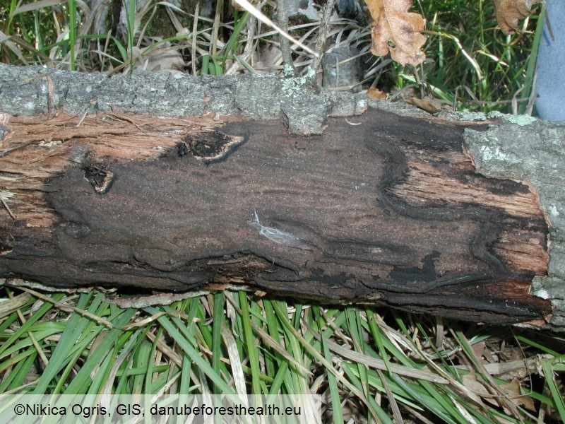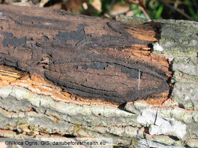The endophytic presence of this fungus in living bark enables it to quickly enter the stressed tissues of the host and destroy them. The leaves in the coppice turn brown. Bark dies off in strips. Next year the bark begins to crack and falls off in June (Fig. 1). In summer a conidial stage may be produced, consisting of a pinkish-grey layer on the wood. In August the first perithecial stromata are observed in bark cracks on tree trunks and branches (Fig. 2). The fruiting bodies are flat, black, slightly convex, ellipsoid, and elongate stromata. Next spring a large number of stromata on the bark of dead trees develop; more than hundred of them can be found on a single tree and they can merge together forming a large stroma (up to 36 cm or more in length) (Fig. 3).