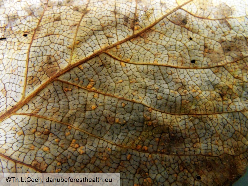 Melampsora-species are recognized mainly by a bright orange-yellow dusty coating on the lower leaf-surface in summer on poplar leaves: these are the spores of the haploid stage of the fungus, the uredo-form. At first, rather angular yellow spots of irregular outline and size develop on the upper surface of the poplar leaves. These spots may turn brownish and blackish-grey during the summer. Some time later, round pustule-shaped uredinia (uredospores producing fungal tissues) are formed on the undersides of the leaves (hand-lens!, fig.1). On these, uredospores are produced in high numbers subsequently covering the whole leaf-surface. These spores can quickly infect further leaves of poplar. In autumn, the uredinia are replaced by minute dark pustules, the telia (Fig. 2). They contain teliospores, which hibernate on the fallen leaves in the litter. In the following spring, the teliospores germinate to produce wind-spread basidiospores, which infect the alternate host (depending on the rust-species herbaceous plant- and woody species). The spore types developed on these hosts then infect the young poplar leaves.