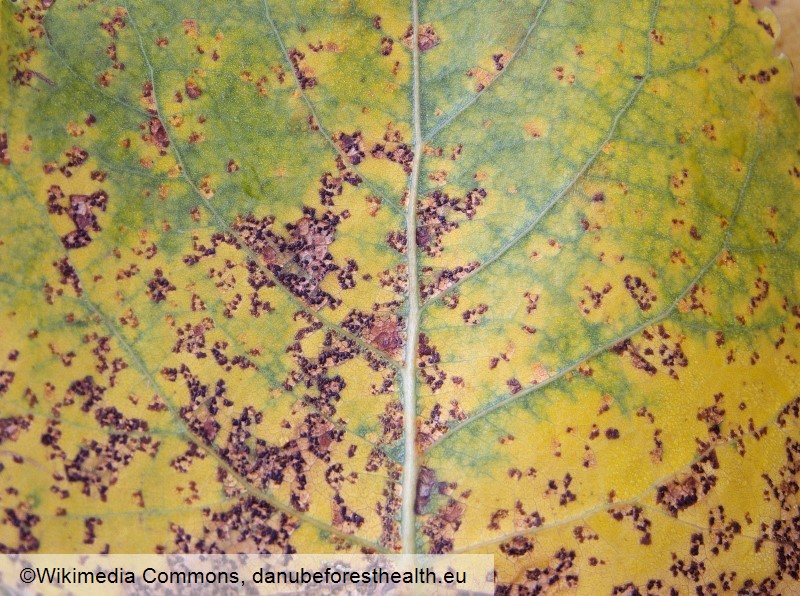 Poplar rusts are able to cause premature loss of leaves, when they spread explosively in summer by their uredospores. Though there is usually no serious damage, a total defoliation can predispose the poplars to other damaging agents. Poplar clones used for afforestation are meanwhile usually more or less resistant to these rusts. One of the species, M. medusae, of North American origin, has a quarantine-status in Europe, since it is known there from a few countries only. It cannot be distinguished from the European Melampsora species in the field.