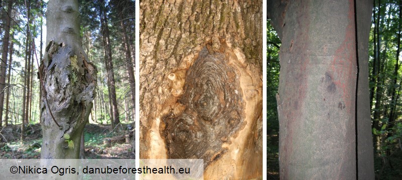 Fig. 1. Cankers caused by Neonectria ditissima (from left to right): on maple, ash, beech