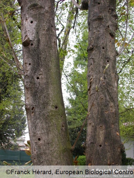 The citrus longhorn beetle (Anoplophora chinensis), which is also a quarantine pest. The main difference is in the texture of the base of elytrae, which is smooth in A. glabripennis but covered with small granules in A. chinensis. Also, A. chinensis larvae develop in the lower part of the host, lower trunk and in roots. Similar symptoms and signs are caused also by certain native insecs, such as Cerambyx cerdo, Morimus funereus, Lamia textor and Cossus cossus.