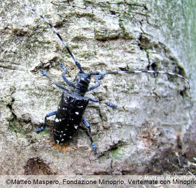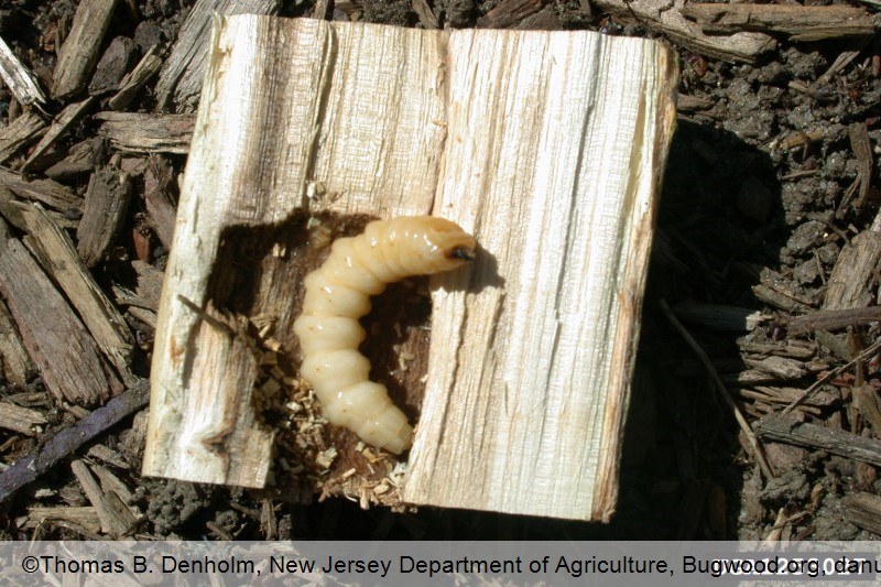 Adults are 25–35 mm long beetles. The body is black and shiny. The beetle has up to twenty irregularly shaped white to yellowish spots on elytra. Antennae are longer than the body and striped. Eggs are white, elongate, 5–7 mm long. Larvae are cream white, with a dark brown to black head, without legs. A grown larva measures 30–50 mm in length. It has a chitinous brown mark on the dorsal side of the prothoracic segment. The pupa is 27–38 mm long, cream white, with clearly visible extremities of the adult beetle. The Asian longhorn beetle is highly polyphagous. Larvae develop in hardwoods of more than hundred species, in the upper part of the tree trunk and in thick branches. Development in the wood lasts one to three years. Adults emerge from May to September through round, 10 mm wide exit holes.